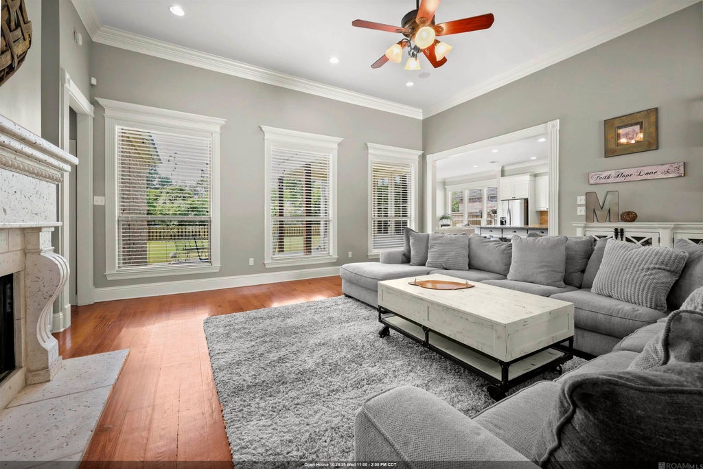Located near Dutchtown area schools, step into this stunning two-story, 4 bedroom, 3.5 bath home located in the highly desirable Cypress Alley Subdivision, a charming, one-street neighborhood. You are welcomed by soaring 12 & 14 ft. ceilings, rich pine floors in the den & formal dining area and walls of windows that offer lots of natural light. The gourmet-style kitchen features a commercial-grade gas stove, LOTS of cabinets, an oversized island with a prep sink, bar-top seating, extra storage, and a walk-in pantry. Just off the kitchen, the keeping room is anchored by a brick fireplace and a shiplap accent wall, with French doors that open to the patio and large backyard. The very spacious den has built-ins on both sides of the gas log fireplace and a standout feature: a professionally installed home theater system with a discreet hideaway 106" custom-designed 3D projection screen mounted in the ceiling in front of the fireplace. The large primary suite showcases a custom board and batten accent wall, views of the backyard and patio, and French doors that open to the Ensuite bath. The spa-like bathroom includes a Jacuzzi tub, separate vanities, a large corner shower, a spacious wrap-around walk-in closet, and lots of storage. Also on the main floor are a guest bedroom with a full bath and a dedicated office. Upstairs is light and bright with two bedrooms and generous closet space, a Jack-and-Jill bathroom, and a balcony overlooking the backyard. Even the spacious laundry room is cute with a tin feature wall. Located minutes from I-10, shopping, restaurants, and top-rated Ascension Parish schools, this home perfectly blends comfort, space, and high-end features in every detail. Don’t miss your opportunity to make it yours!