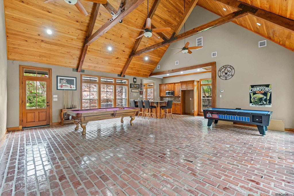 Looking for a house with a mother-in-law suite fit for royalty?? This home boasts an approximate 1000 square foot addition that would be perfect for just such a purpose! With soaring 22 foot, cypress ceilings, a full bathroom, kitchen and access to the exterior of the home it is definitely worth considering! (Pictures coming to aid in envisioning the potential.) Staged as a gameroom now, which is also quite impressive. Plenty of space for office, living, dining, bedrooms, unlimited options! Bonus there is a double gate to the backyard adjacent to the addition to add parking if needed, a covered porch and hook-ups for an outdoor kitchen just outside the door. The home is situated on .623 of an acre, so there is plenty of space outdoors for everyone to enjoy! All 4 bedrooms have handscraped, hardwood flooring. The living room, office, hallways and foyer have luxury vinyl. The kitchen, breakfast, keeping area and addition have brick flooring. The exposed brick around the fireplace and oven/microwave area are beautiful focal points. No expenses spared in these updates ~ the master bath features marble countertops and walk-in shower, a cast iron, claw foot tub with wainscotting surround and a walk-through closet. The kitchen features 3 cm, bull nosed granite, painted white cabinets, wall oven, built-in microwave, a gas cooktop and a walk-in pantry. Bonus - beautiful sunroom with a/c vents! Great layout with the walk-through laundry room accessible from the bedrooms. Whole house generator also on the premises! The crane statues, air hockey table, pool table, refrigerator and dryer are reserved by the seller.