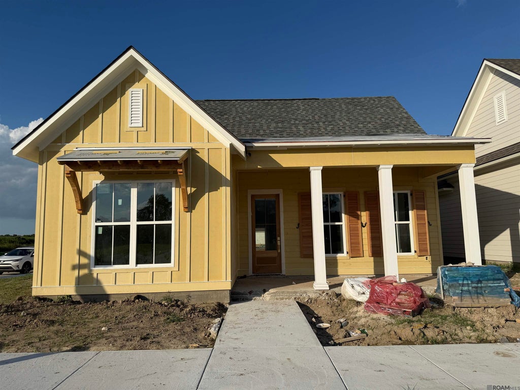 Middleton floorplan by Level Home underway on a corner lot in The Settlement at Live Oak! The Middleton is a one-story 2400 sq foot home with four bedrooms and three full baths. You will enter this home from the inviting front porch with bricked steps and a hanging gas lantern into the foyer / dining room which will lead you into the open living and kitchen. The dining room is located off the foyer and living space and looks out to the front porch and streetscape. The living room is centered around a vent-less gas fireplace with quartz surround and has the option to add custom built-in wall units. The stunning kitchen features custom painted cabinets with 5’’ cabinet hardware pulls & under cabinet lighting, a large center island with single basin granite composite sink & over-hanging pendant lights, stainless appliances including a gas cooktop with single wall oven, Carrara Blanco quartz countertops, Murali Matte tiled backsplash & a walk-in corner pantry. The master suite is privately located at the rear of the home & features a premium master bath layout which includes a separate rectangular soaking tub, custom tiled shower with a bench & a seamless glass enclosure, dual vanities with quartz countertops, custom framed mirrors & a huge walk-in closet. Bedrooms two & three share a full bath & bedroom four has it’s own bathroom. The large utility room with a linen closet & an optional mud bench area is located off the garage entry. The spacious courtyard porch is covered & is perfect for outdoor entertainment! The yard will be professionally landscaped & fully sodded. Est completion date of Dec 2025, buyer can pick/approve certain colors & options for a limited period of time. The Settlement at Live Oak offers beautiful homesites in the heart of Thibodaux along Bayou Lafourche & features an abundance of green spaces, large recreational lake, luxurious community pool and pavilion, scenic ponds, local shopping, dining & more! Other lots/plans available.