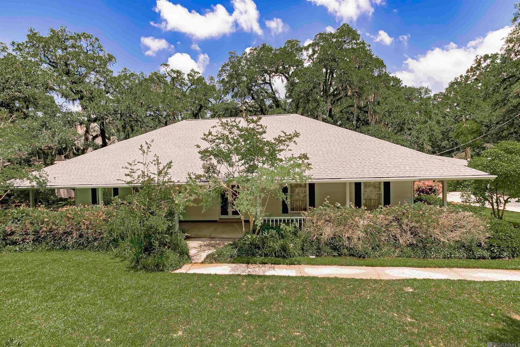 NEW ROOF, ICONIC LIVE OAKS, ACREAGE, A HIDDEN GEM IN CENTRAL! Tucked beneath a beautiful cluster of mature live oak trees, this 4-bedroom, 2-bath home on 1.49 acres offers Southern charm, a peaceful setting, endless potential, and luxury of land—right in the heart of the beloved Central Community. A brand-new roof crowns this estate with Old St. Louis brick and a 780 sq ft covered front porch that welcomes you. Step into the grand foyer that sets the tone for the entire home. With glowing walnut-parquet wood floors, 9ft ceilings, a stunning crystal chandelier, and ornate glass double doors. Over 3,100 square ft- the spacious layout includes a grand formal dining/keeping room with a vintage chandelier, natural light, and classic details. The cozy den offers custom cypress walls, and a brick fireplace that anchors the heart of the home. The kitchen is a standout with granite tile countertops, a 5-burner gas cooktop, double wall ovens, and extensive cabinetry. There is more- a wet bar with coy tile and a charming sunroom that has panoramic backyard views. The primary suite is oversized with access to the backyard, dual closets, and an ensuite bath with a jetted tub/shower combo. Each secondary bedroom is impressively large, offering generous closet space and share a full bath. Outdoors, the home continues to impress: a driveway with ample parking, covered carport with storage rooms, and multiple patio areas shaded by draping Spanish moss. There’s space to roam, relax, or even add a pool or guest house. The views of the oak-draped landscape from every angle make this an exquisite property! From the craftsmanship to the setting, this home is a rare blend of space, warmth, and location—ready to be loved and lived in for generations to come.