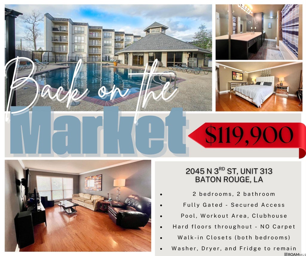 Riverview Condominiums! Fully Gated Baton Rouge Living complete with privacy and amenities! Look no further! Close to entertainment, restaurants and all the nightlife downtown Baton Rouge has to offer. As an owner at Riverview Condominiums you have gated access to a pool, work out space and club house. Unit 313 is 2 BR/2BA and located on the 3rd floor. Condo features wood floors in the living areas, ceramic tile in kitchen and granite counters in the kitchen with a breakfast bar. The primary suite has an en-suite bath with double vanities, a large walk in closet with a bonus additional closet with built in shoe racks. Washer/Dryer and Refrigerator included. Owner is willing to sell fully furnished! HOA fee includes: internet, cable, water, sewer, trash disposal. Schedule your viewing today!