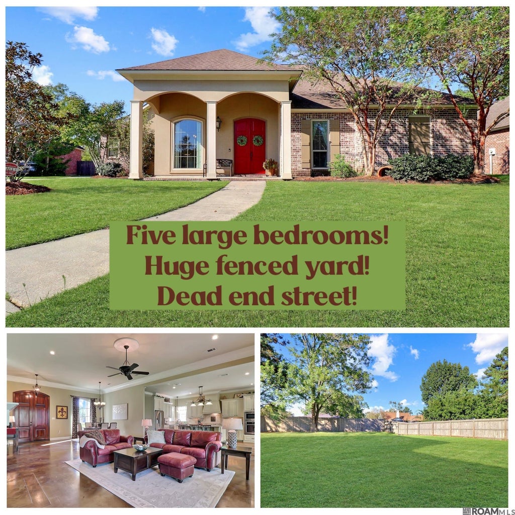 Welcome to 3630+ sq ft of beauty and functionality in the highly sought-after Green Trails Subdivision! This stunning 5 bedroom, 3.5 bath custom-built home sits on an oversized lot and offers the perfect combination of space, style, and comfort. Only 12 years old, this thoughtfully designed home features a wide open floor plan filled with natural light and oversized windows showcasing a fully fenced backyard. Inside, you’ll find scored and stained concrete floors throughout the first floor—beautiful, durable, and easy to maintain. The quadruple split floor plan allows for privacy and flexibility, with one bedroom and half bath upstairs that could easily serve as a home office, guest suite, or playroom. All bedrooms are spacious with generous closets. The chef’s kitchen boasts a large island, gas cooktop, oversized pantry, and plenty of room for entertaining. A cozy gas fireplace, massive back porch, and extended driveway with ample parking make this home as practical as it is inviting. The large garage provides excellent storage and workspace options. Located on a quiet cul-de-sac street, residents enjoy lush greenspace, meandering sidewalks, and a warm neighborhood feel. The home is walking distance to Southern Oaks Athletic Club, a vibrant hub offering tennis, a heated and cooled pool with splash pad, fitness classes, swim teams, gourmet meals, and community events. Visit soacitup.com for more info. This incredible location also puts you minutes from popular Baton Rouge restaurants, shopping, and boutiques. Come experience why Green Trails is one of the city’s most desirable communities. Schedule your private showing today and fall in love with this exceptional home!