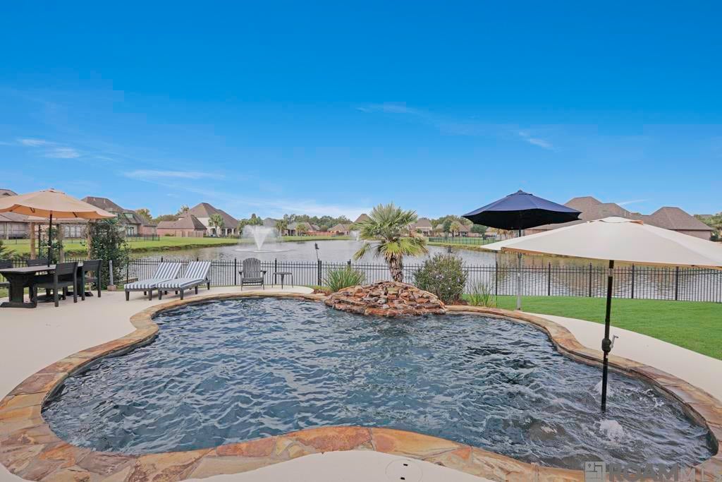 Step into this stunning 4-bedroom plus office home in the coveted gated community of The Settlement at Lakeside, where luxury and everyday ease go hand in hand. Zoned for top-rated Prairieville High, Galvez Middle, and Sugar Mill Primary, you’ll enjoy peace of mind knowing you are part of a thriving academic community. Entering you’re greeted by soaring 12-foot ceilings and a wall of windows overlooking the lake, setting the tone for a home that’s both sophisticated and welcoming. The kitchen is the heart of the home, featuring a 5-burner gas stove, spacious walk-in pantry, and custom island ideal for morning coffee, homework, or weekend brunch. Retreat to the spacious primary suite, where the 15x11 bath features a 6 ft jacuzzi tub and custom-tiled shower, your personal spa after long days. The 15x6 walk-in closet offers generous space to keep organized. The separate 12.5 x 6 office makes remote work simple. Throughout the home, you’ll find thoughtful upgrades that make life more beautiful and convenient: new White Oak wood floors for a sleek, modern feel underfoot, plantation shutters for both privacy and easy decor complement, and 14 energy-efficient windows with a lifetime warranty that let in natural light while keeping utility costs low. Enjoy peace of mind with a new HVAC system (just 3 months old) and a 5-year-old roof, offering years of worry-free living. Step into your own private sanctuary with a 160 sq ft tiled outdoor living area and low-maintenance gunite saltwater pool, perfect for relaxing dips on warm afternoons. Best of all, enjoy serene lakefront views with dancing fountains as a backdrop that brings calm and beauty to your everyday life. Never flooded and no flood insurance required, this home blends luxury, functionality, and stunning outdoor living into one exceptional opportunity. Call today to schedule your private showing!